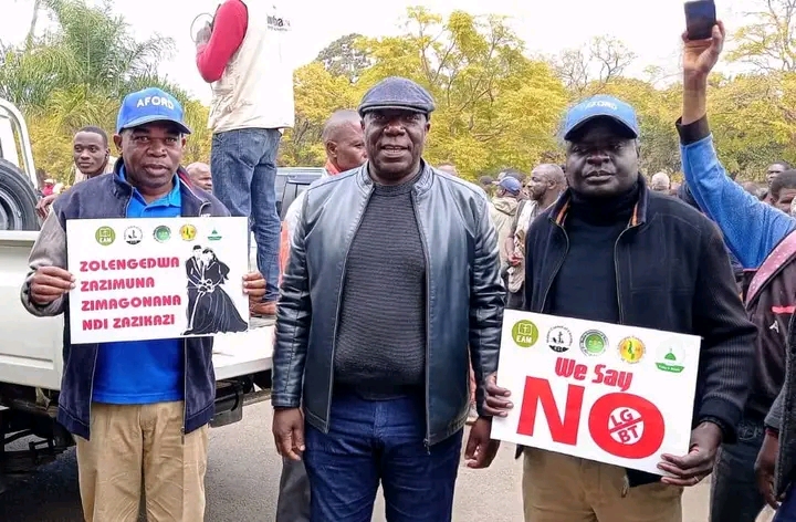 The Alliance for Democracy ( AFORD) leader Enoch Kanzingeni Chihana was on Thursday, July 13, 2023, in Lilongwe one of protesters who took to the streets to protest against the introduction of same sex marriages in country through court doors.