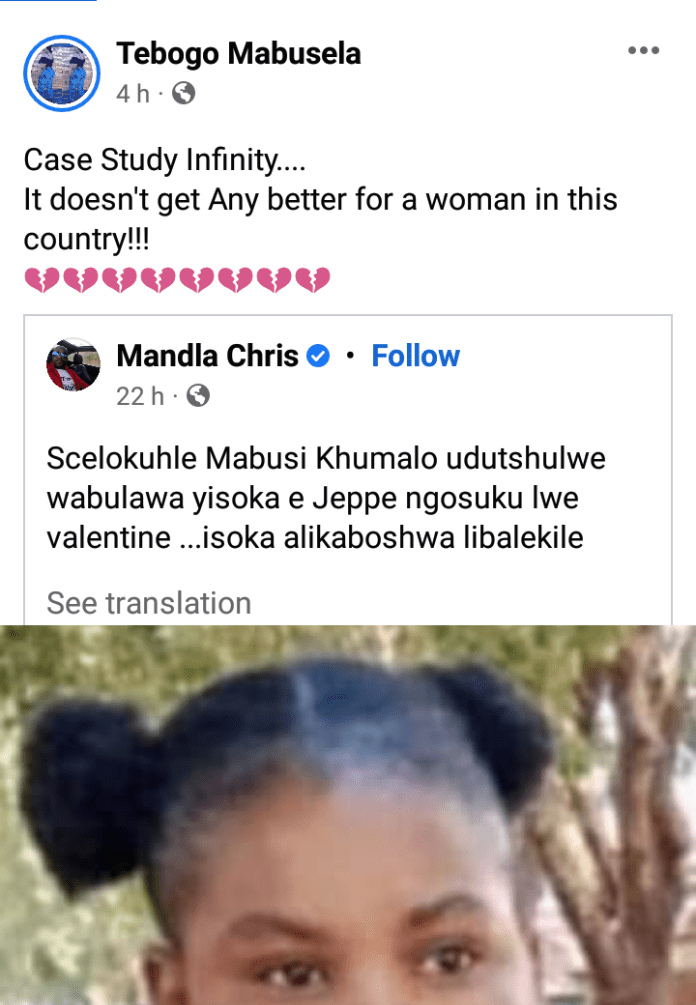An 18-year-old girl, Scelokuhle Mabusi Khumalo, was allegedly shot by her boyfriend in Berea, Johannesburg, South Africa.