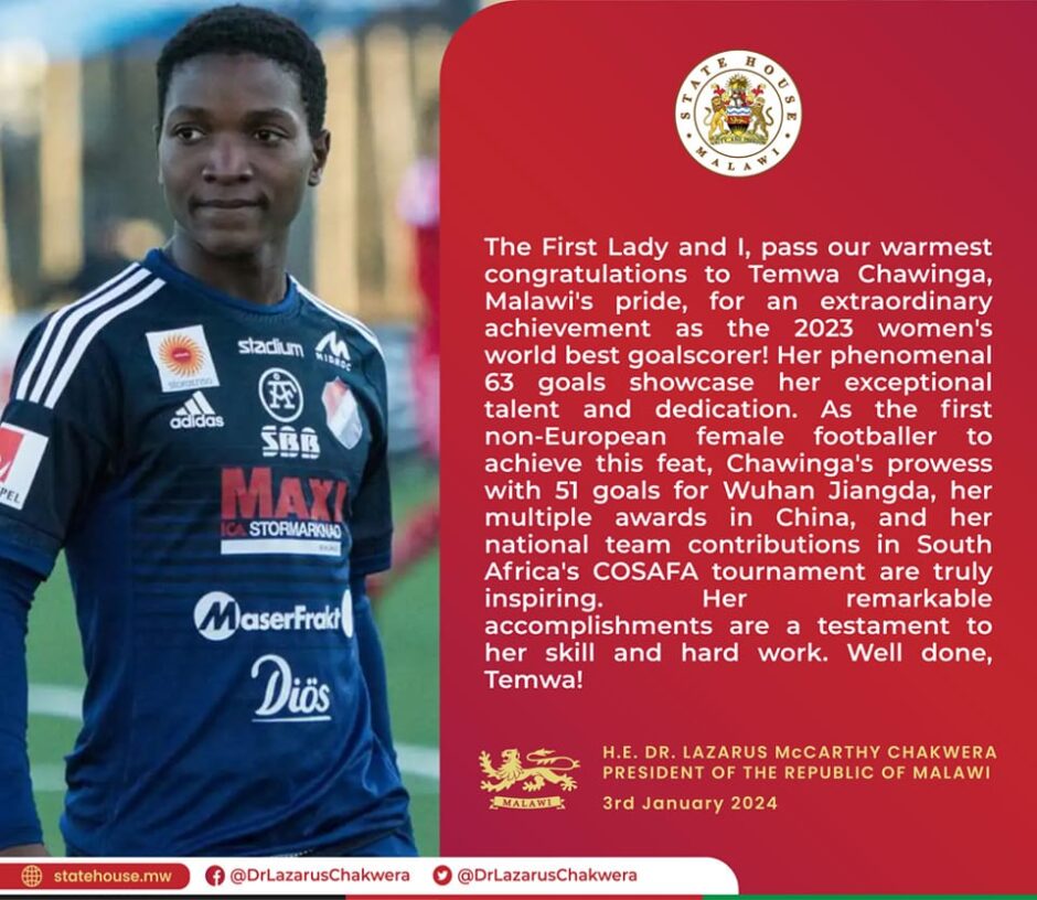 President Lazarus Chakwera has hailed the performance of Malawi Women’s forward, Temwa Chawinga after being named as the women’s world best goal scorer by the International Federation of Football History and Statistic (IFFHS).