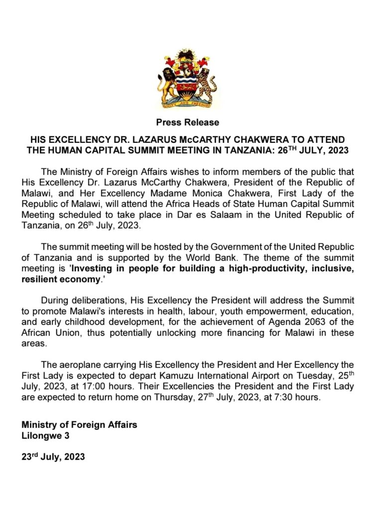 The statement further indicated that President Chakwera and first lady will return on Thursday, 27 July 2023.