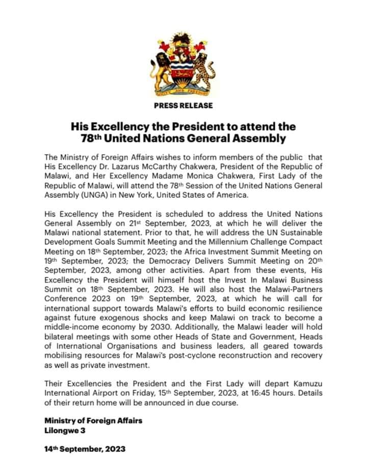 Through a statement released by the Ministry, President Chakwera is scheduled to address the United Nations General Assembly on 21st September, 2023 at which he will deliver the Malawi national statement.