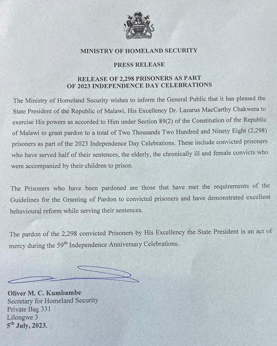 Malawi President Dr. Lazarus Chakwera has pardon 2,298 prisoners as part of this year’s independence celebrations.