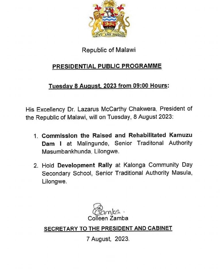Malawi President Dr. Lazarus Chakwera will tomorrow on Tuesday commission the Raised and rehabilitated Kamuzu Dam 1 at Malingunde in Lilongwe.