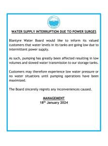 In a statement released on 18 January 20224 that Face Of Malawi have seen, BWB has emphasized that the problem has greatly  affected pumping process resulting in low volumes and slowed transmission to their tanks.