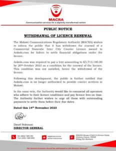 Malawi Regulatory Authority (MACRA) has withdrawn the renewal of a Commercial Domestic Inter City Courier Licence issued to Ankolo.com for failing to settle financial obligations under the license.