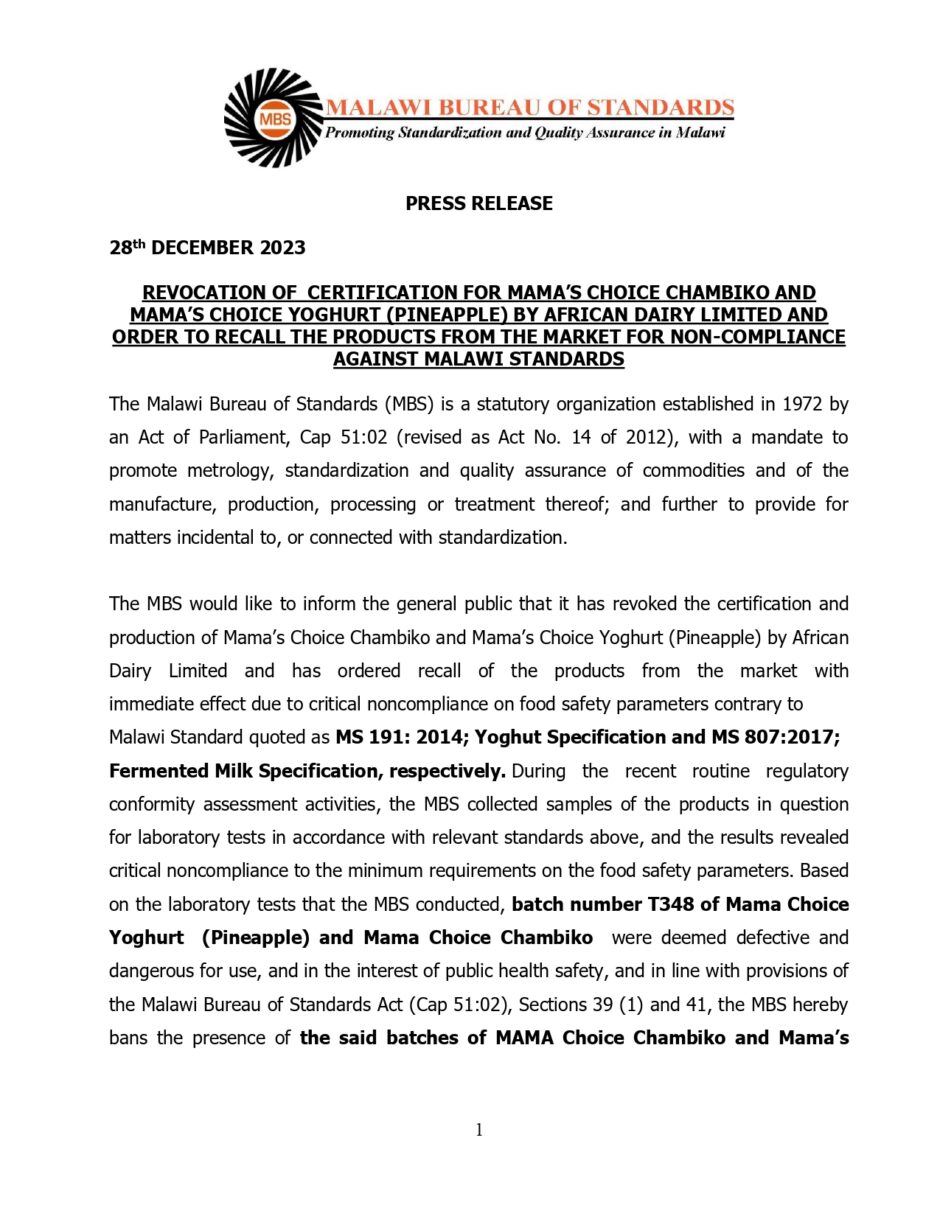 The Malawi Bureau of Standard (MBS) has declared Mama’s Choice Chambiko ndi Mama’s Choice Yoghurt (Pineapple) produced by African Daily Limited as unfit for consumption.