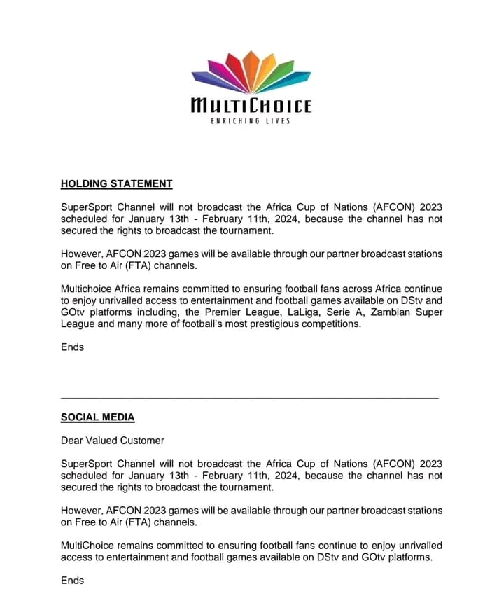 Multichoice Africa Limited has announced that SuperSport Channels will not be able to beam live the 2023 African Cup of Nations (AFCON) scheduled to commence on January 13, 2024.