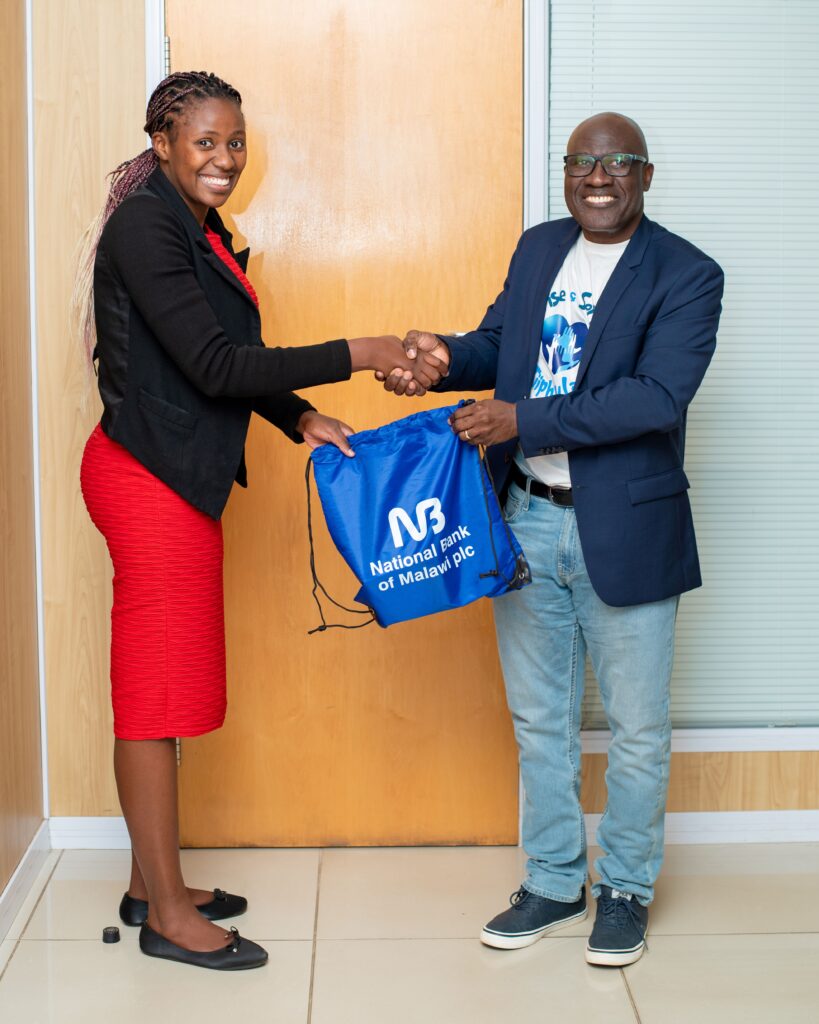 NBM plc CEO Macfussy Kawawa (right) presents a gift to a customer