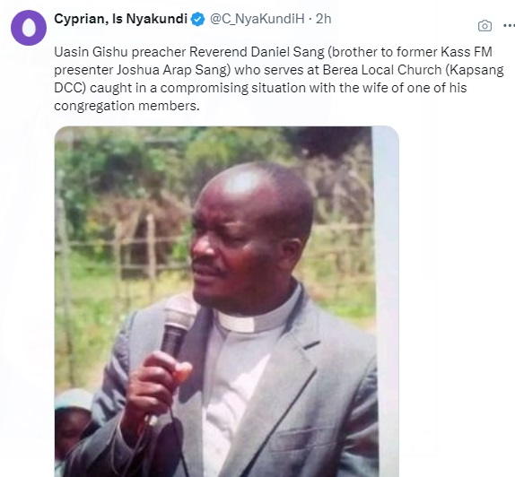 Identified as Reverend Daniel Sang, he serves at a church in Kapsang and is the brother of former Kass FM presenter Joshua Arap Sang.