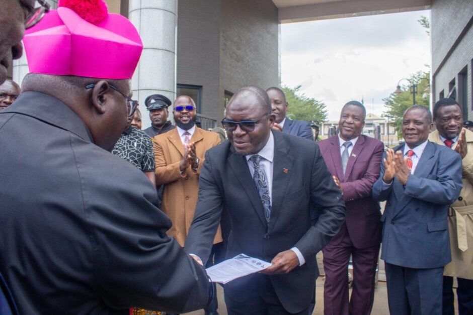 Most Rev. George Desmond Tambala presenting petition to Hon Yusuf Nthanda