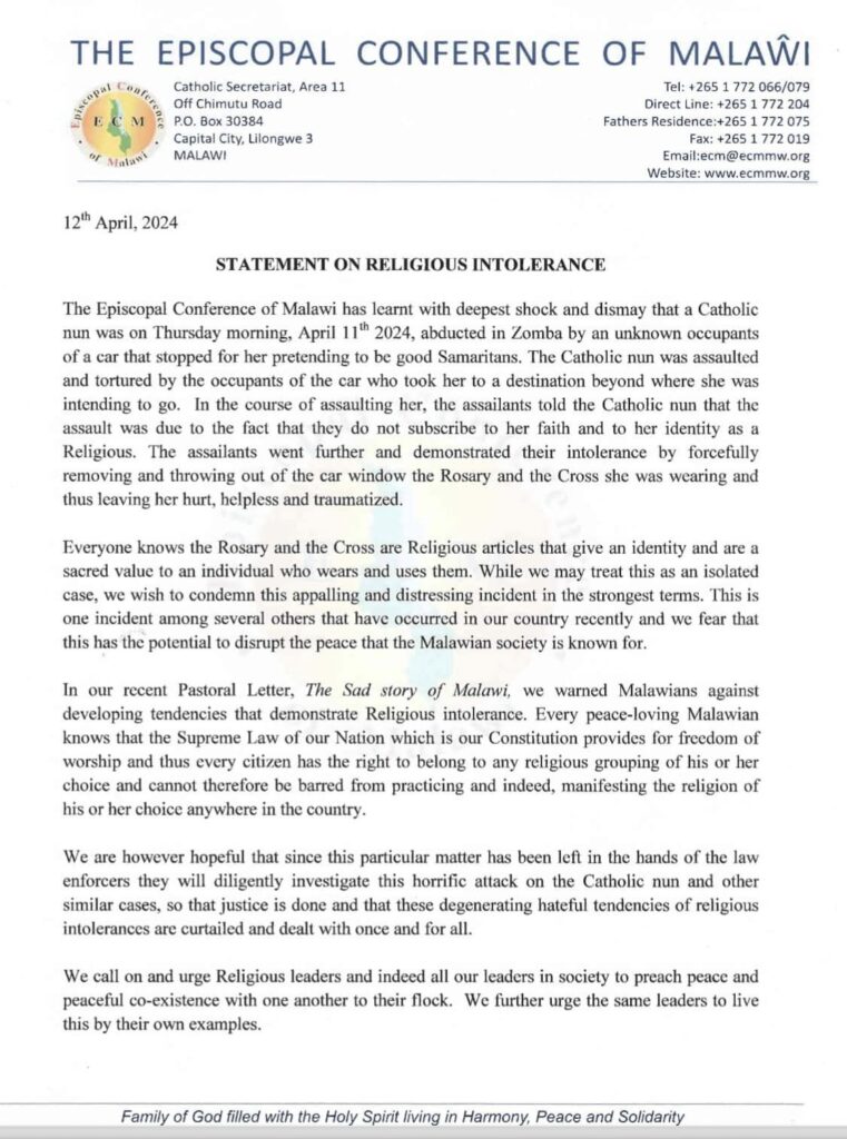 The Episcopal Conference of Malawi (ECM) has strongly condemned the abduction of a catholic nun on Thursday morning in Zomba district.