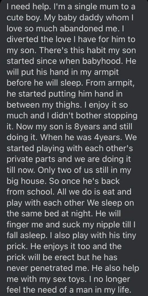 A single mother has taken to social media narrating how she is used to having s3x with her 8 year old biological son and that she is devastated now that her mother has decide to take the child to be under her care.